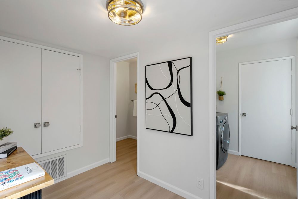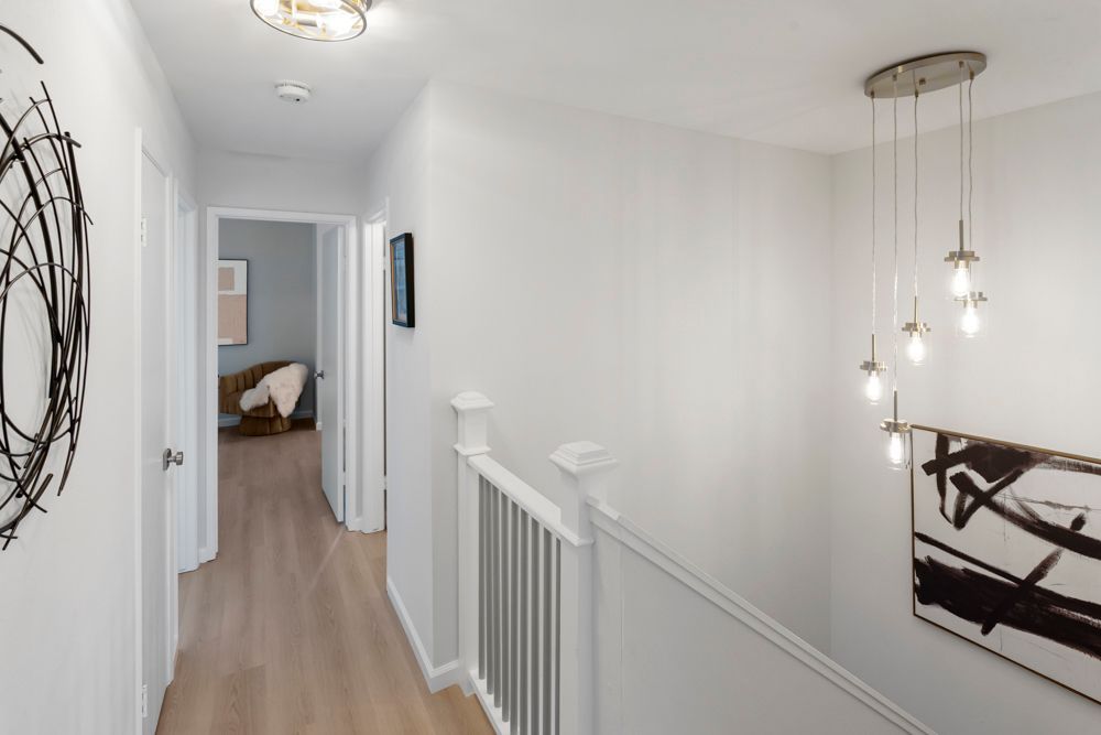 Floating steps and a cluster of pendant lights guide you upstairs, where the stairwell feels open and bright rather than tucked away. In the spacious primary suite, a sliding glass door opens to a private balcony, creating a quiet perch for morning coffee or evening breezes. From here, enjoy peek-a-boo views of the Peninsula hillsides, where rooftops and treetops mingle as soft fog rolls in. Inside, the ensuite includes an updated vanity, a refreshed shower stall with wide-format tile surround, and a walk-in closet. Two additional bedrooms with mirrored closets take in leafy outlooks and share an updated hallway bath with modern vanity and playful starburst tile.