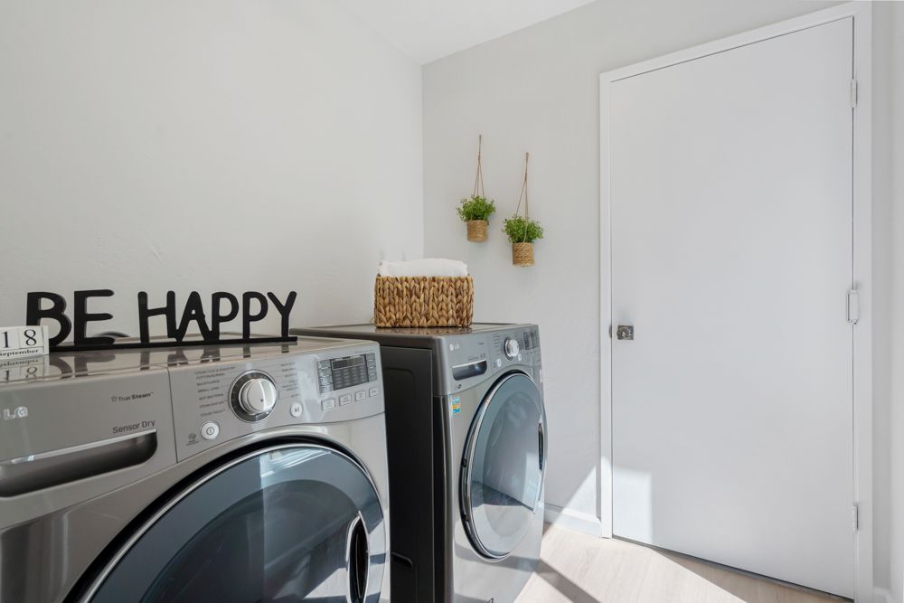 An updated half bath adds convenience and a laundry room with LG machines completes the first floor. The laundry connects directly to the two-car garage, with painted floors underfoot and an extended alcove that provides useful extra storage.