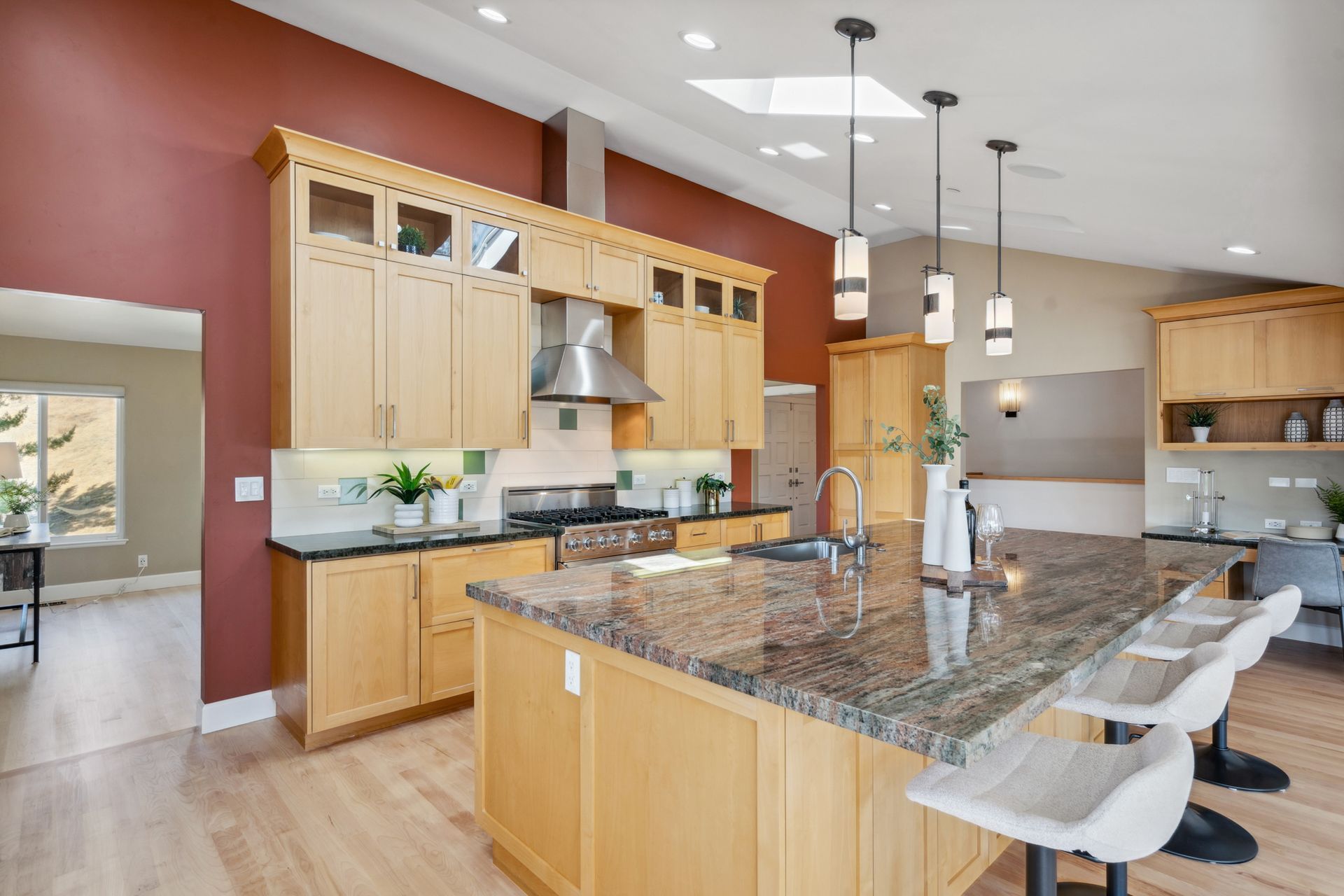 - A granite topped island with an undermount sink anchors the kitchen, while dark granite countertops wrap the perimeter, offering generous prep space