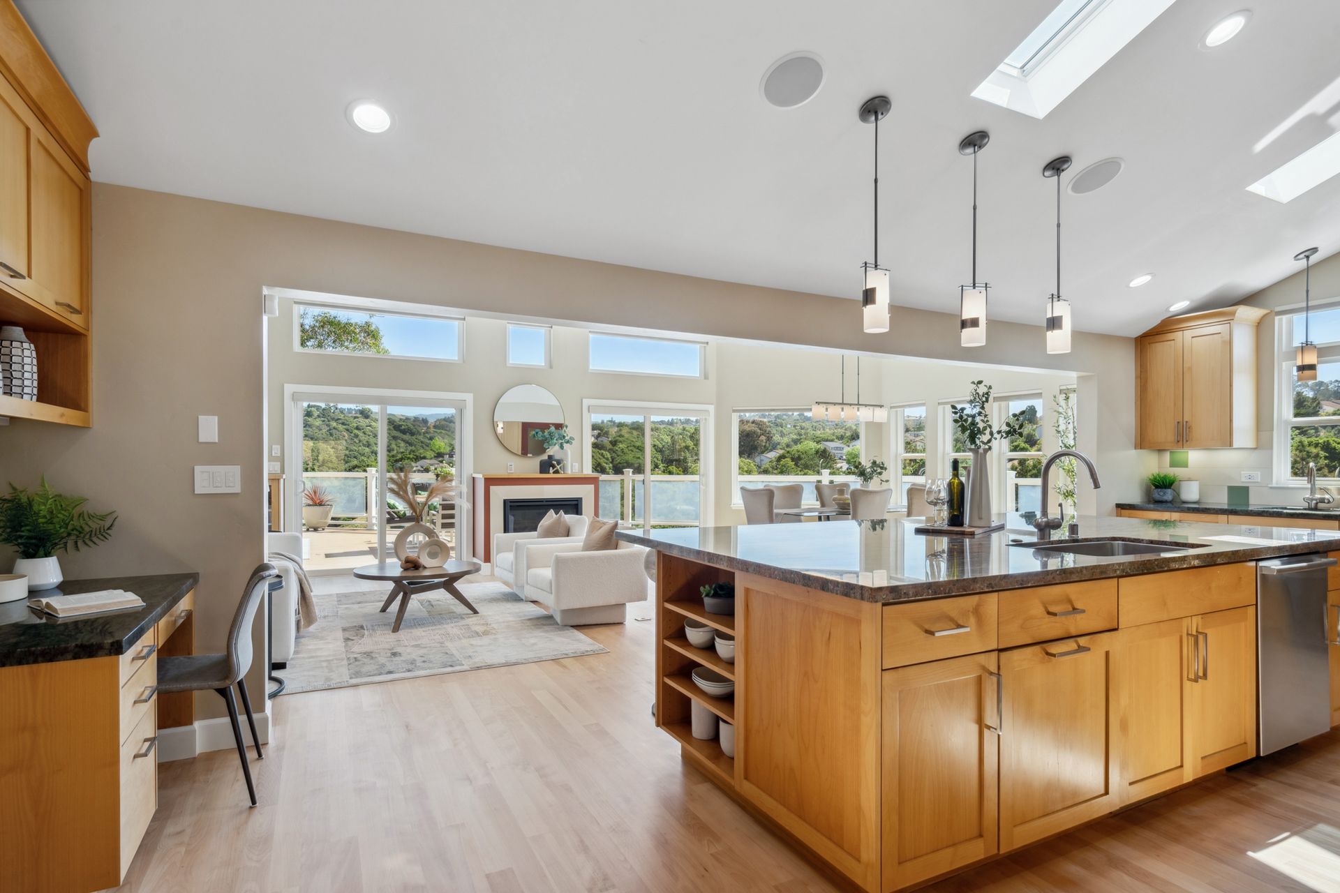 - Three remote-controlled skylights and clerestory windows flood this space with natural light and green views