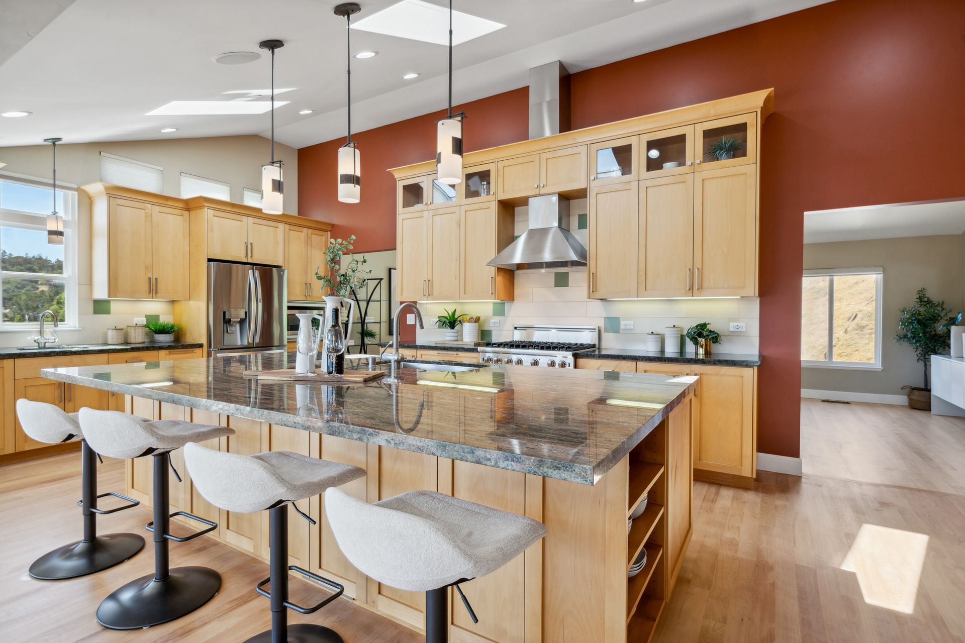 - Full-height maple cabinets with soft-close drawers and pull-out shelving maximize storage