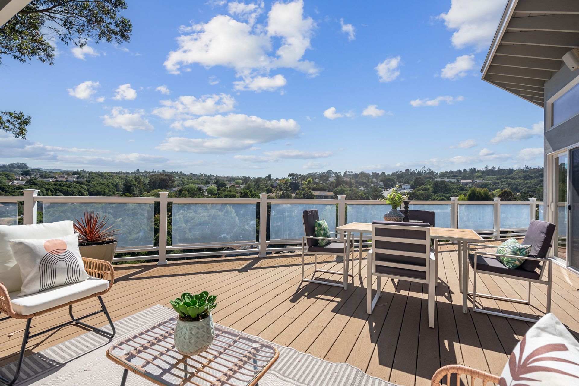 - White-framed glass railing with frosted panels provides privacy without blocking the view