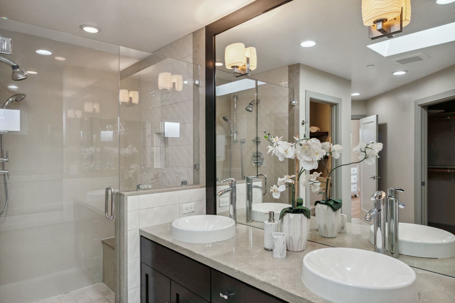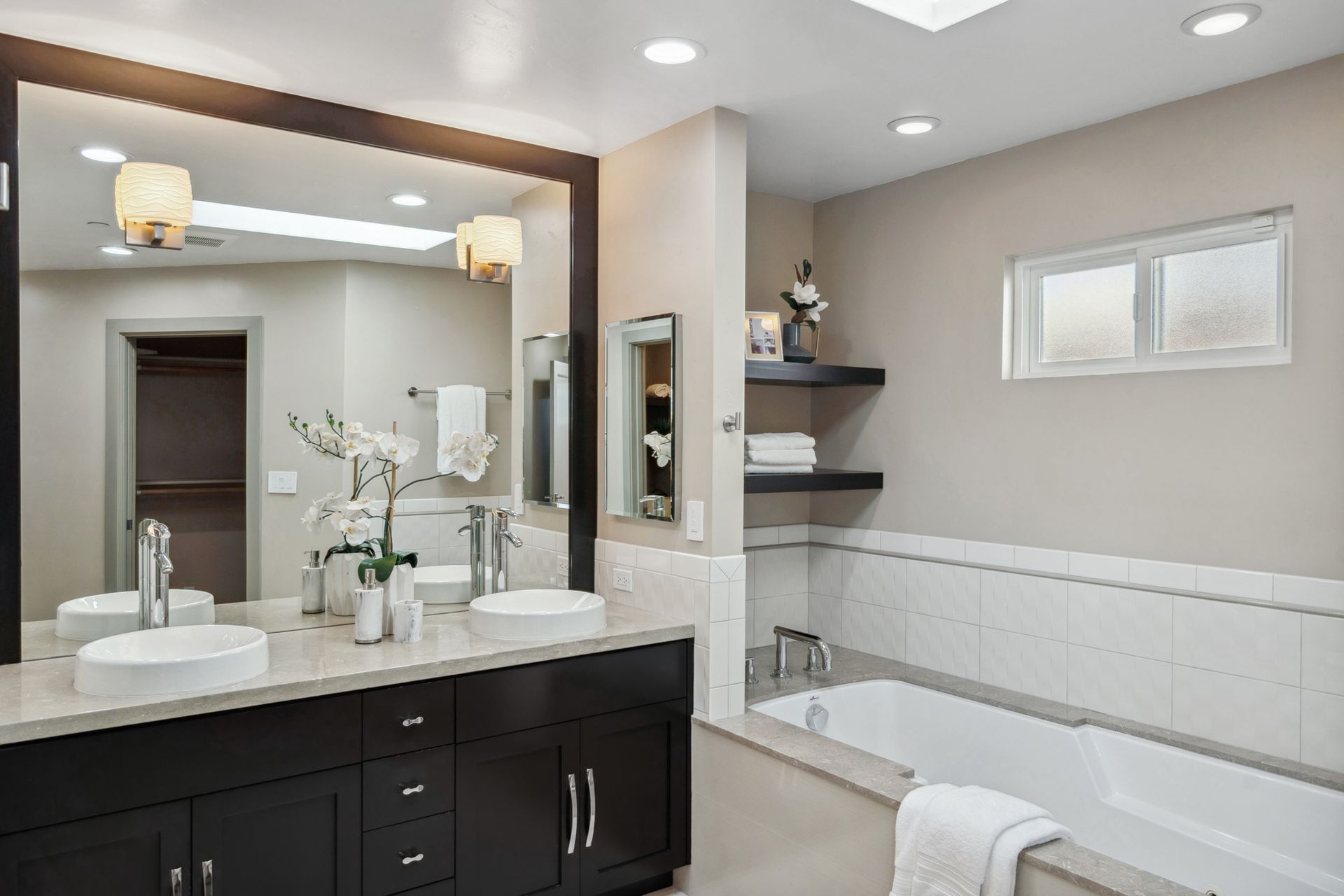 - A large framed mirror with sconce lighting and a skylight provide excellent illumination