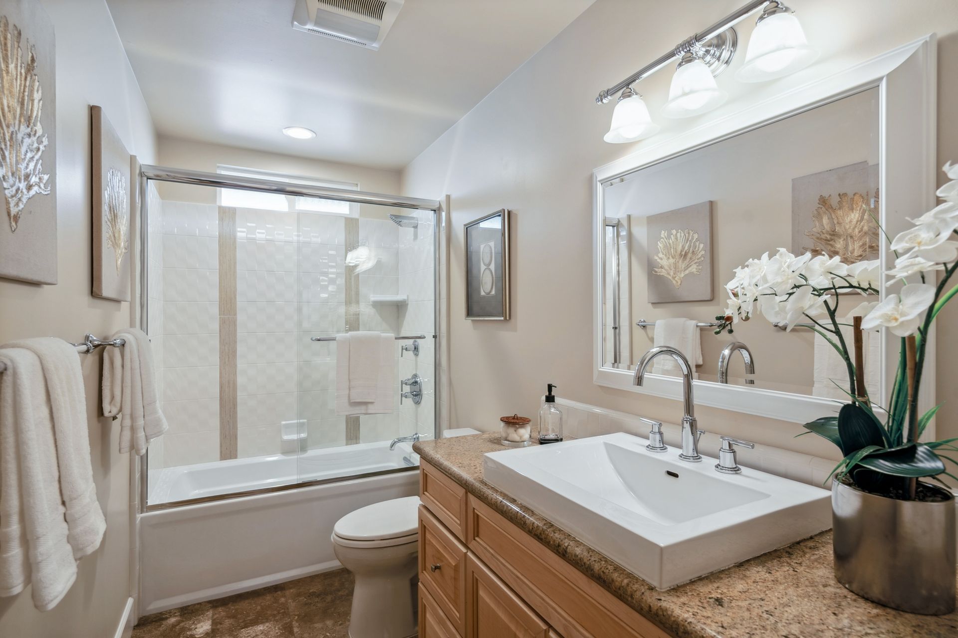 - Share a full hallway bathroom with travertine tile flooring, granite counter, vessel sink, and a shower-over-tub combo with pebbled and bamboo-look tile accents