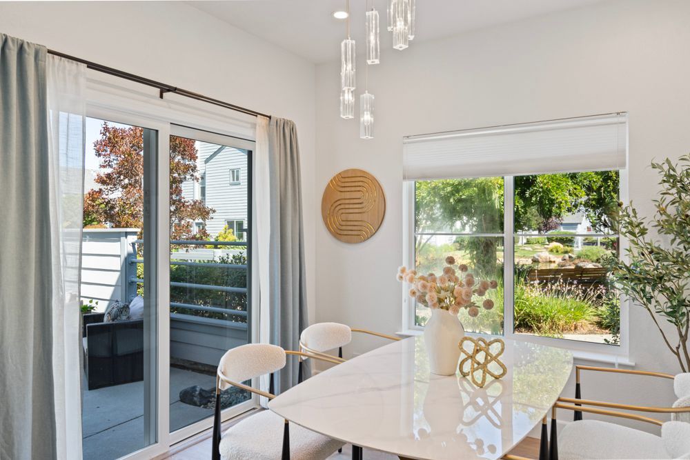 Just off the living area, the dining space is lit by a sparkling crystal chandelier. Its placement offers a view out to the manicured common area and easy connection to the outdoors. A sliding glass door opens directly to the patio, extending the dining experience into fresh air—perfect for dinner parties that flow naturally from inside to out.