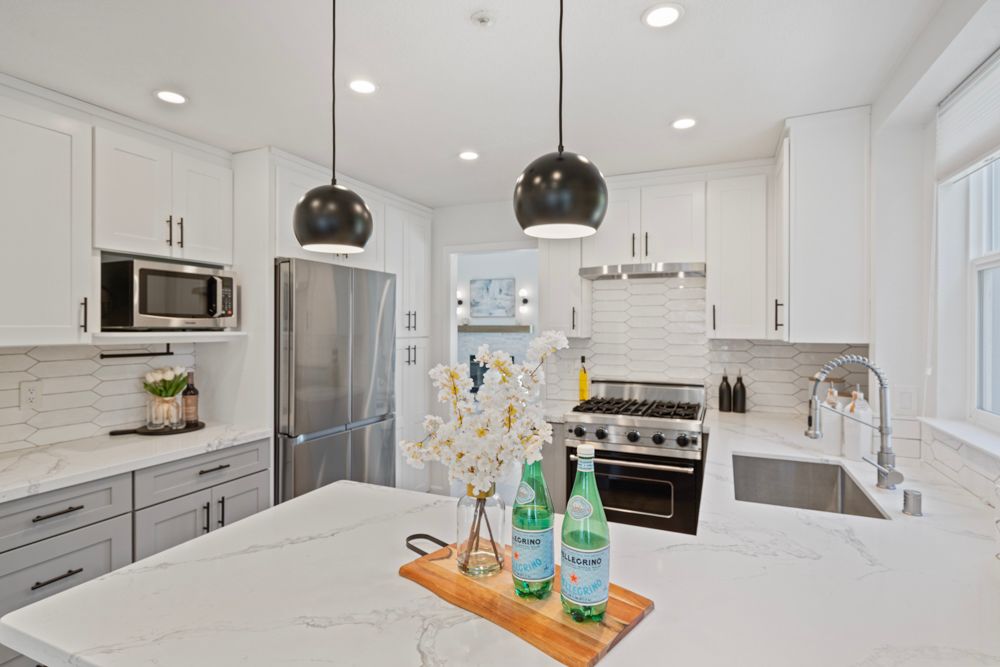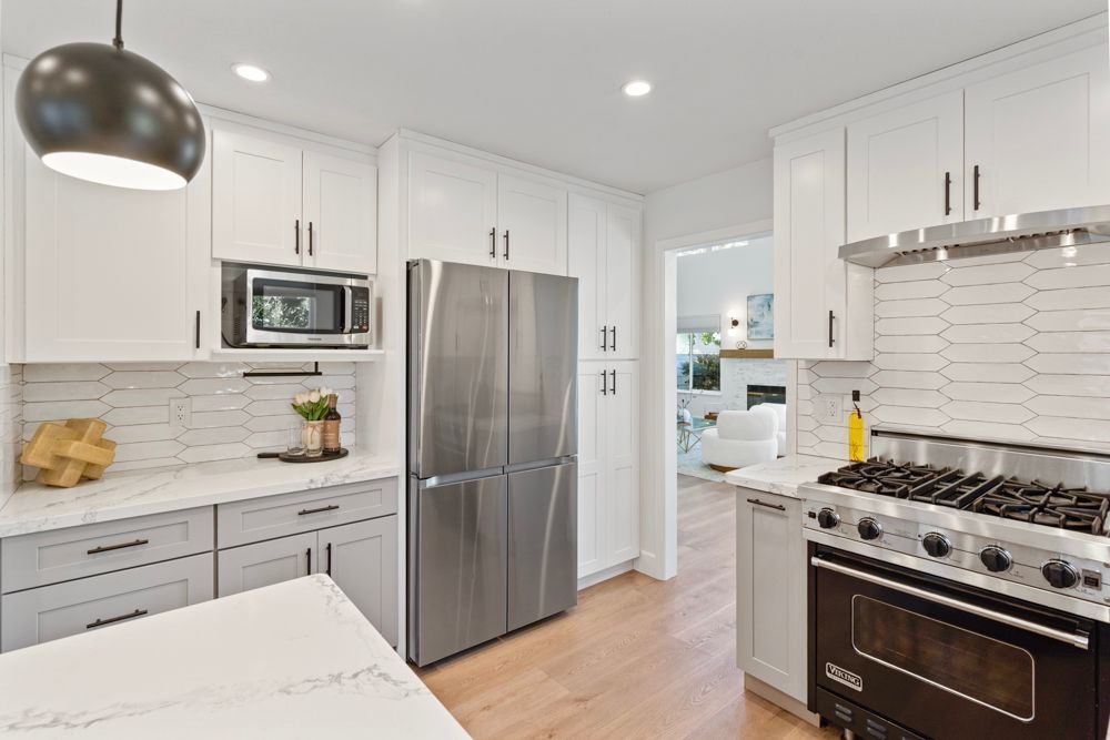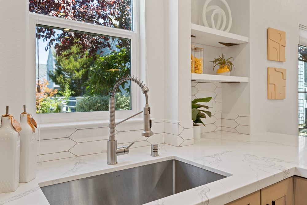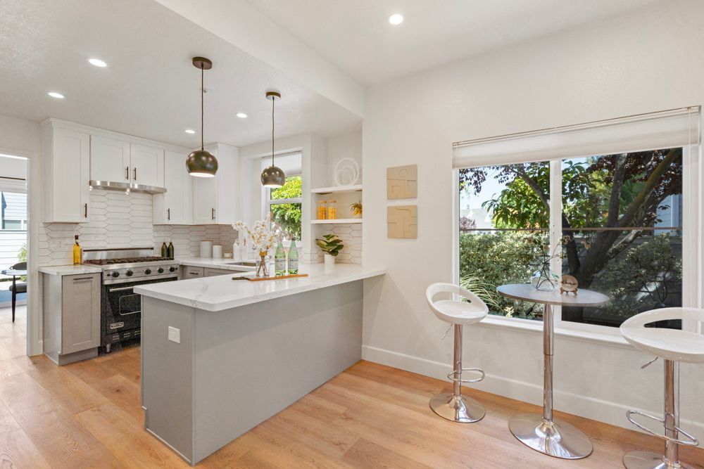 The kitchen is designed for both form and function. A Viking stainless-and-black gas range stands out as a centerpiece, complemented by a Samsung Flex French Door Smart refrigerator, quartz countertops, and a large under-mount sink with an industrial-inspired faucet. A horizontal picket-tile backsplash adds subtle texture. Open shelving provides room for display or bar setup, while pendant lights define the breakfast bar—a casual spot for hosting or simple meals. The adjacent eat-in nook, with its wide window and filtered light from the trees outside, invites morning coffee or quiet meals with a view.