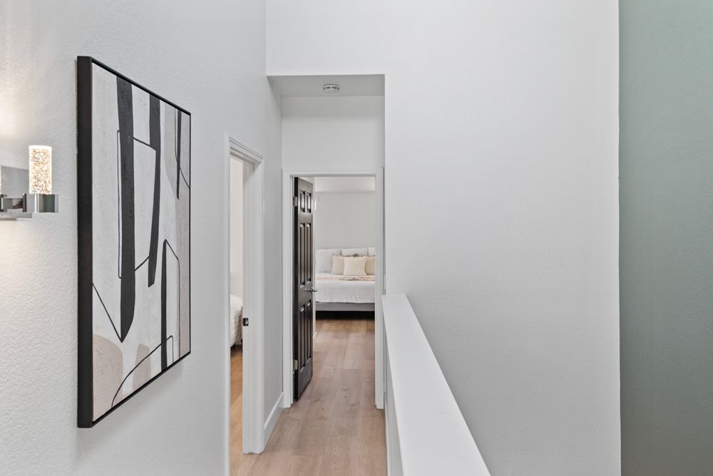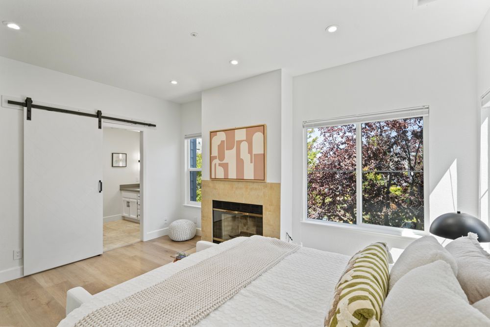 Upstairs, a skylight brightens the landing where a glass banister overlooks the living room below. The primary suite is a true retreat: a fireplace adds warmth, while three large windows frame leafy greenbelt views. A sliding barn door leads to the spa-inspired bathroom featuring elegant tile, double vanities with gray quartz counters, sconce lighting, and a skylight above. A glass-enclosed shower and piano-black soaking tub, wrapped in slate-like tile, complete the luxurious space. Upstairs lighting is fully upgraded, with recessed fixtures featuring temperature-adjustable bulbs to create your ideal ambiance, day or night.