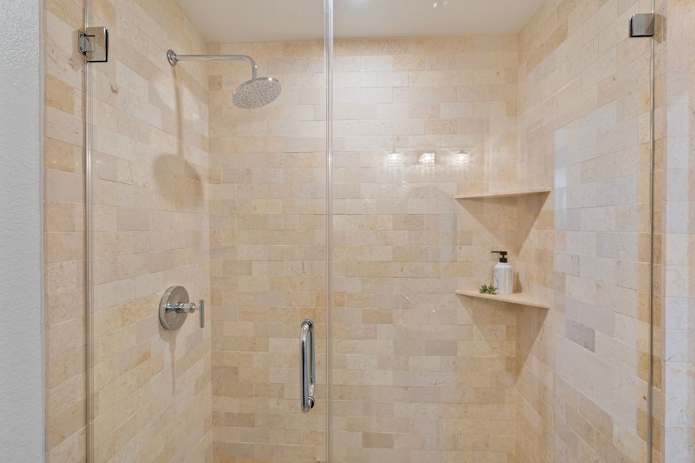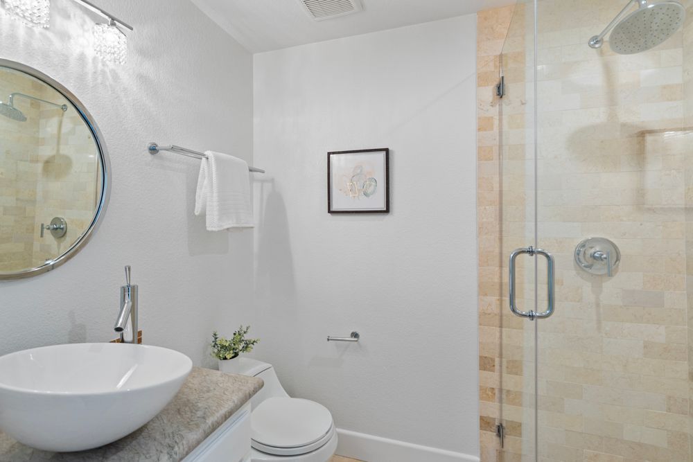 At the end of the hallway, the secondary suite offers vaulted ceilings, clerestory windows, and natural light pouring in. The ensuite bathroom features a chic vessel sink, standing shower, and travertine surround.