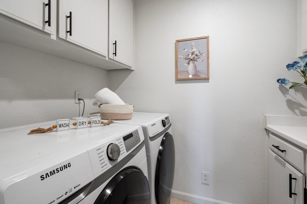 From the entry, a hallway leads to a powder bath upgraded with quartz counters and marble-like veining. A coat closet and an under-stair storage space add practicality. The laundry room includes full-size machines, cabinetry, and a countertop for folding or crafts. The two-car garage, with its separate bay doors, connects directly to the entry and has guest parking just outside for ease.