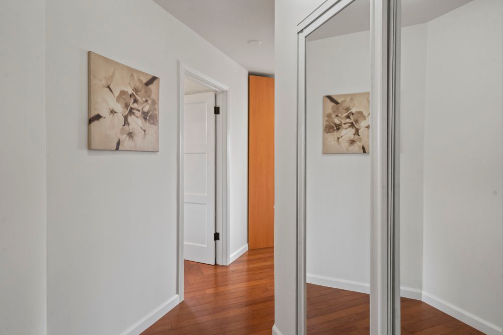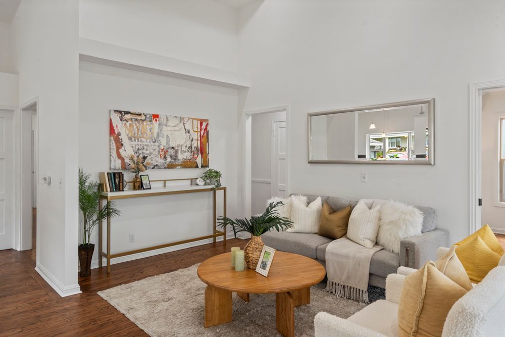Step inside and the home immediately opens up with soaring ceilings and abundant natural light. A convenient entry closet with newly installed cedar flooring adds both texture and function, while a pebbled glass pendant above casts a soft glow from overhead. The open-concept design makes the most of every square foot, while still defining individual spaces with intention.