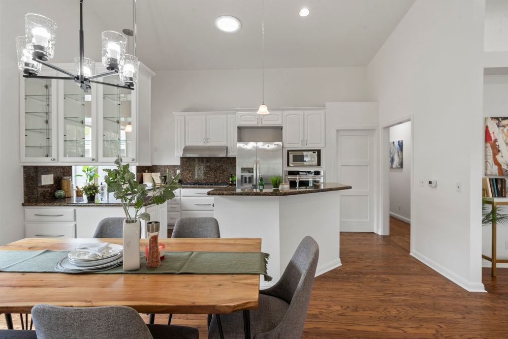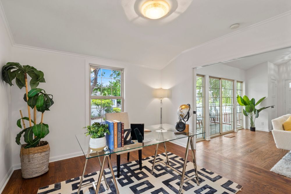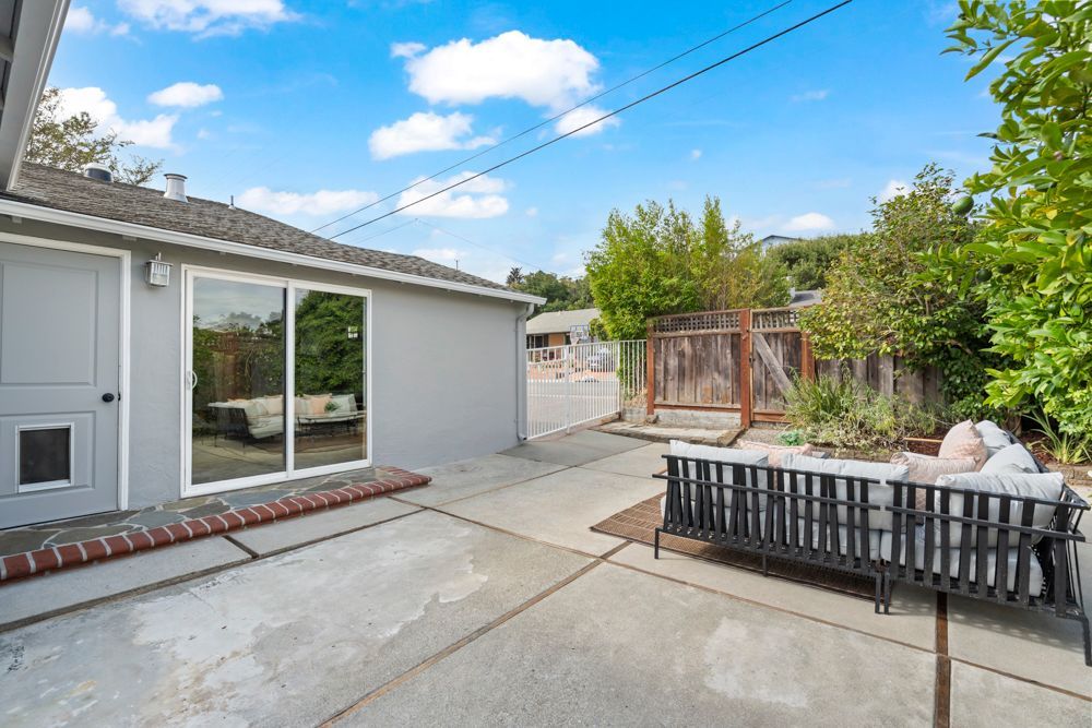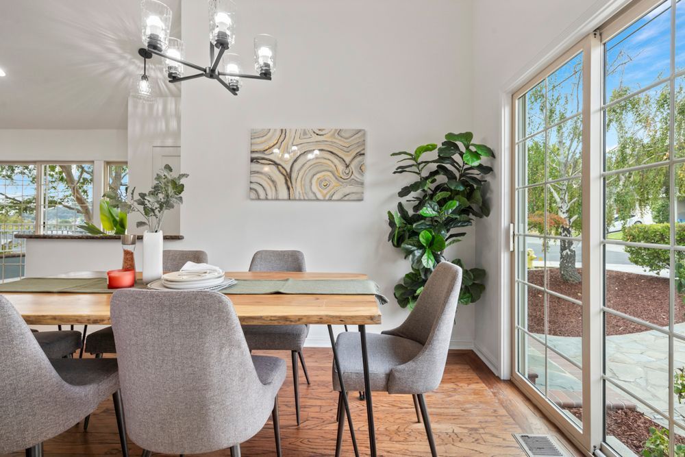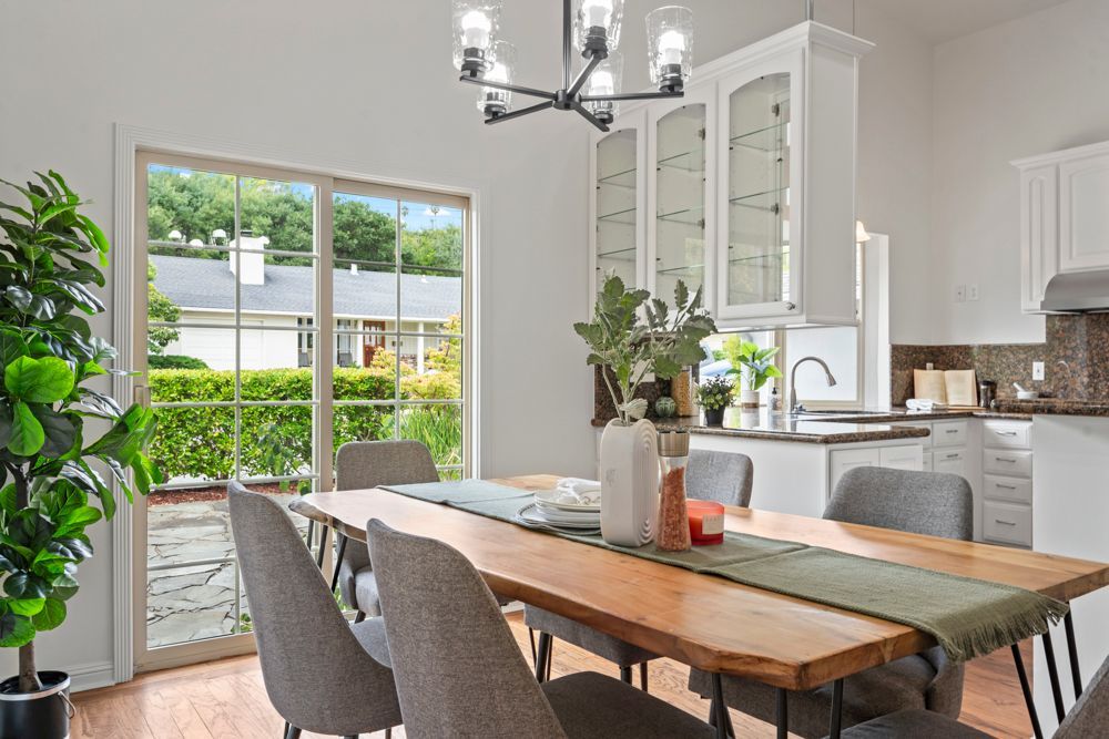 The living room is wrapped in light from large double-pane windows and anchored by glass sliders that open to a raised flagstone patio, perfect for enjoying indoor-outdoor flow in San Mateo’s sunny climate. Adjacent to the living room, the dining space is defined by a modern chandelier and another set of glass doors that lead outside, offering easy access for al fresco meals or morning coffee in the sun.