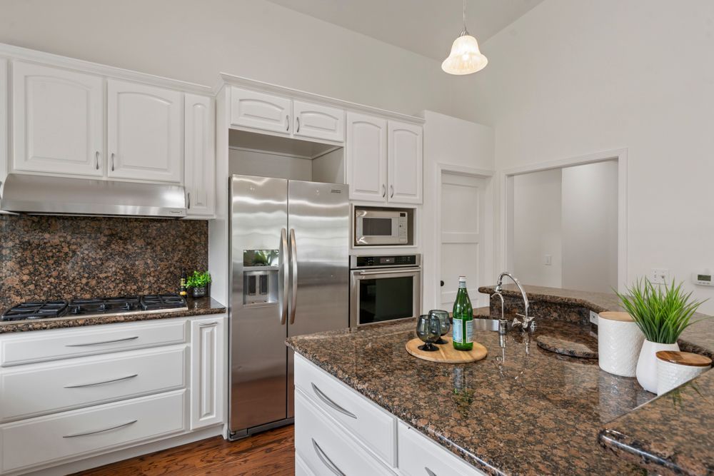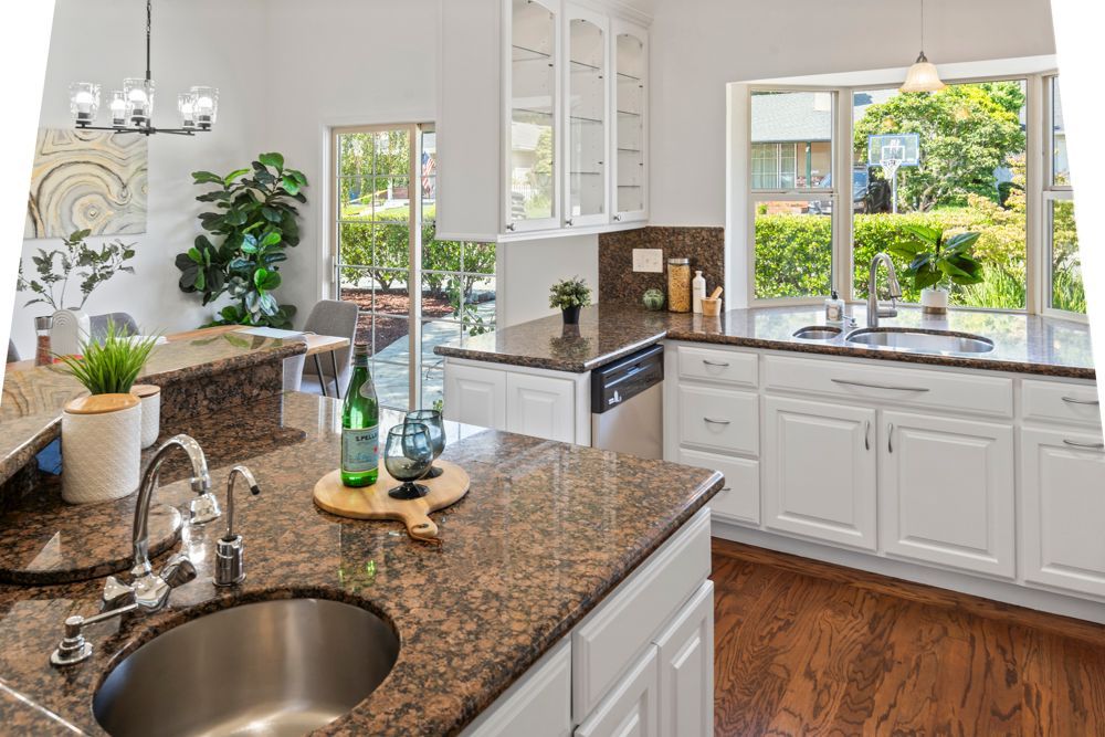 Designed with both function and hospitality in mind, the kitchen centers around a large granite-topped island with a secondary prep sink and seating for casual meals or conversation. Warm maple cabinetry surrounds the space and a large pantry offers additional storage. The stainless steel appliance suite includes a 5-burner gas cooktop with range hood, wall oven, and a side-by-side refrigerator. The main sink is set beneath a wide bay window that frames a view of the front yard, and a solar tube overhead brings even more sunlight into the space.