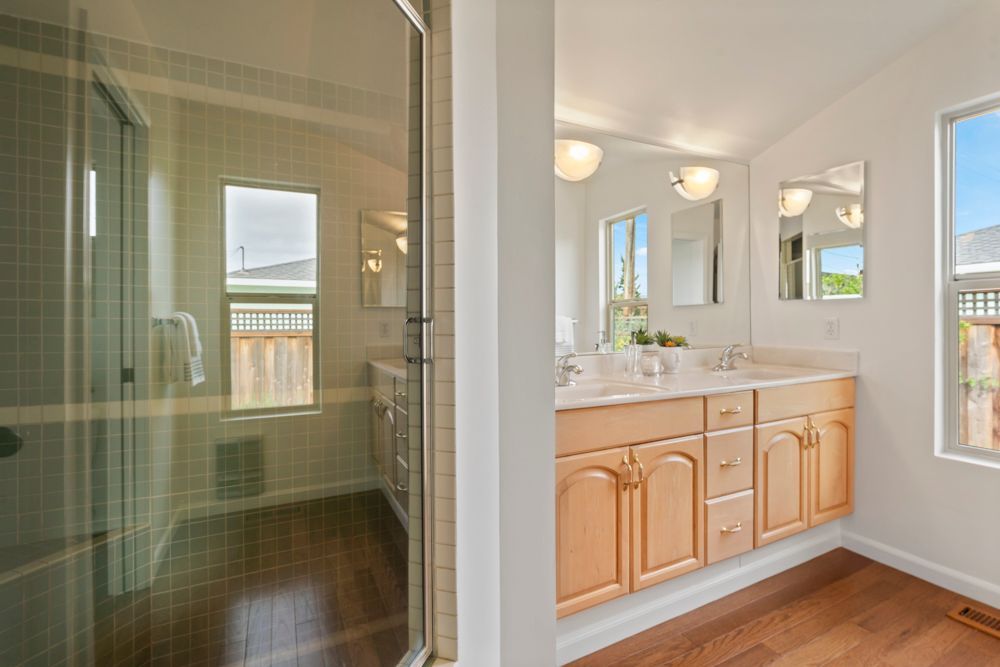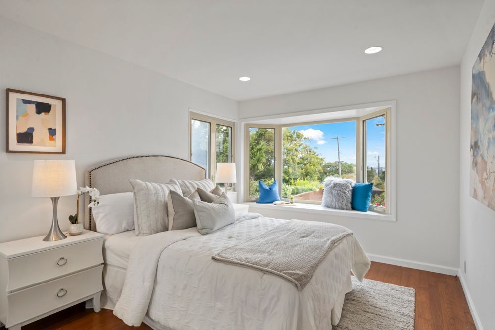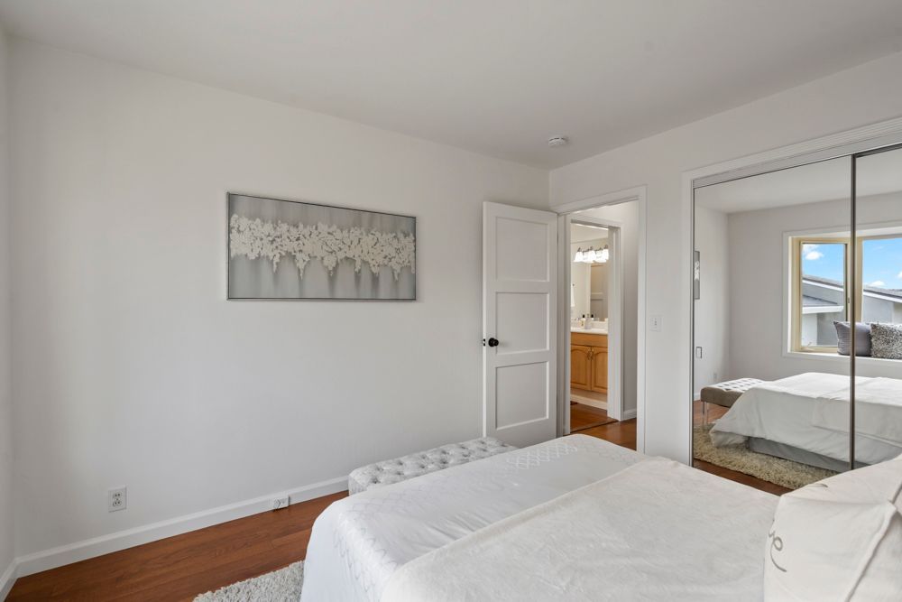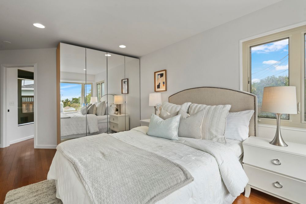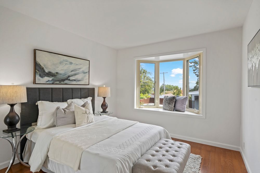Set apart at the rear of the home, the primary suite offers a private and peaceful retreat. Enjoy two closets, one with built-in organizers, and lovely corner windows including a bay window with peek-a-boo views of the Bay and San Mateo cityscape. The ensuite bath features a dual-sink vanity and a tiled walk-in shower, making mornings efficient and relaxing.