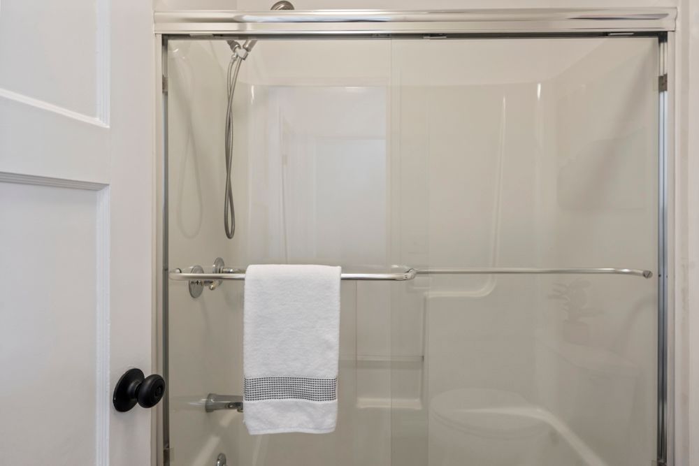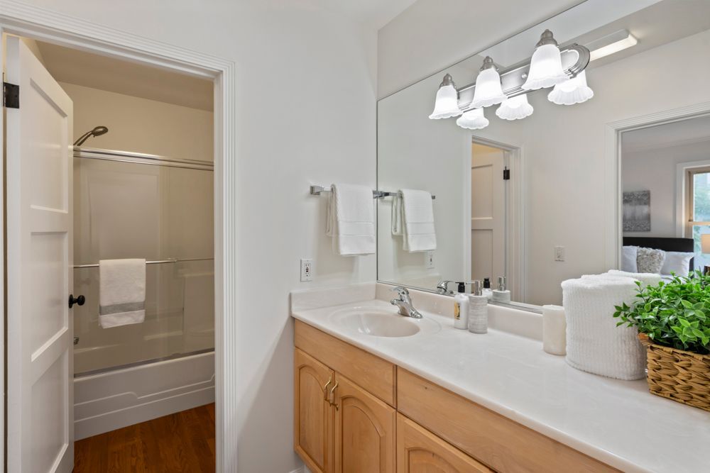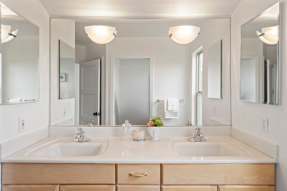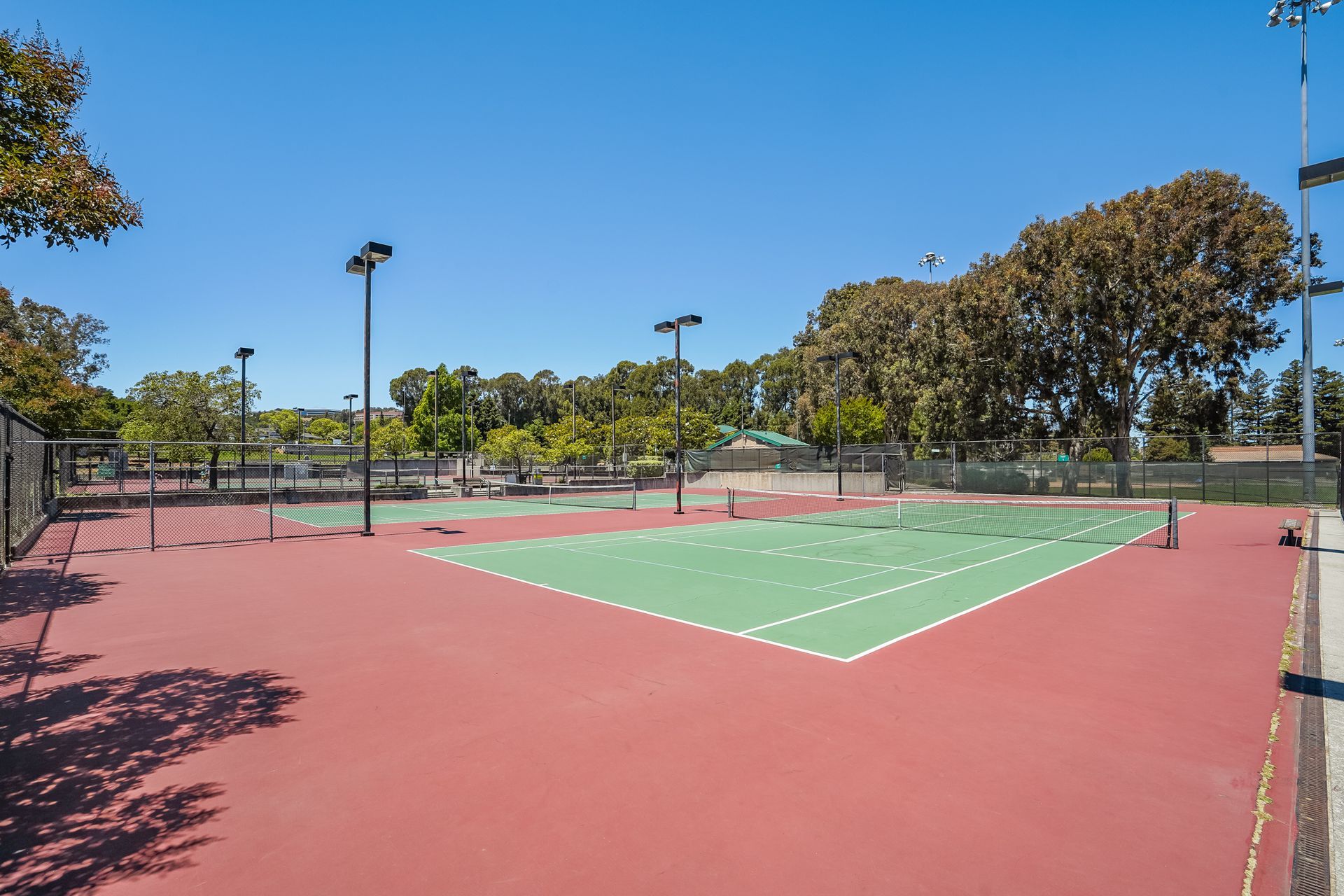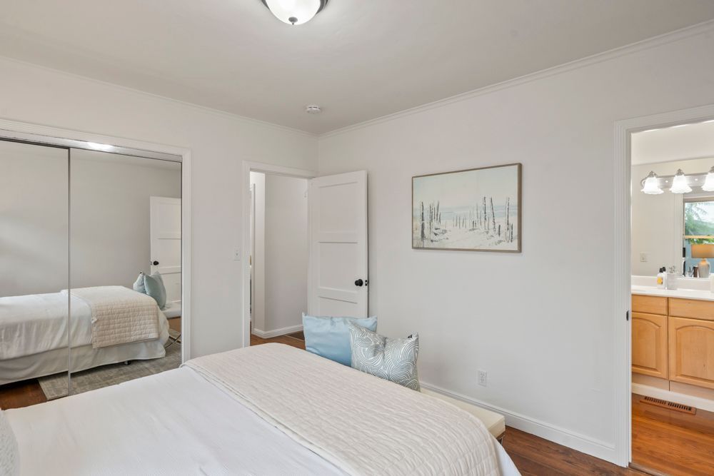 Set apart at the rear of the home, the primary suite offers a private and peaceful retreat. Enjoy two closets, one with built-in organizers, and lovely corner windows including a bay window with peek-a-boo views of the Bay and San Mateo cityscape. The ensuite bath features a dual-sink vanity and a tiled walk-in shower, making mornings efficient and relaxing.