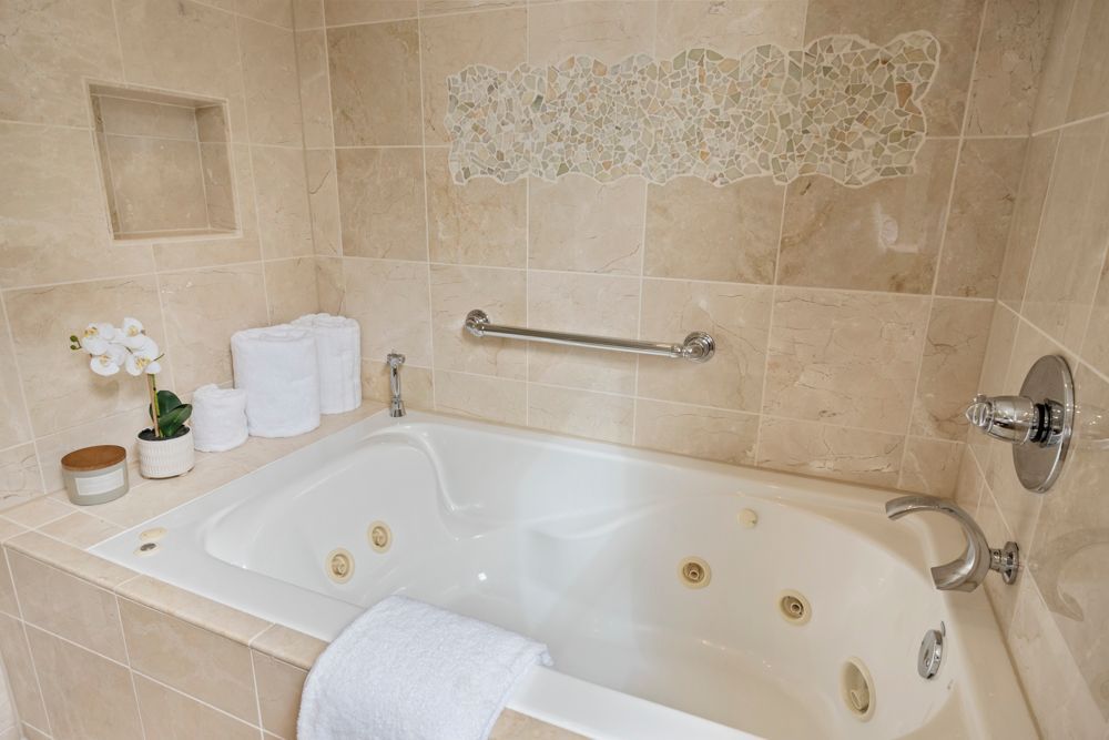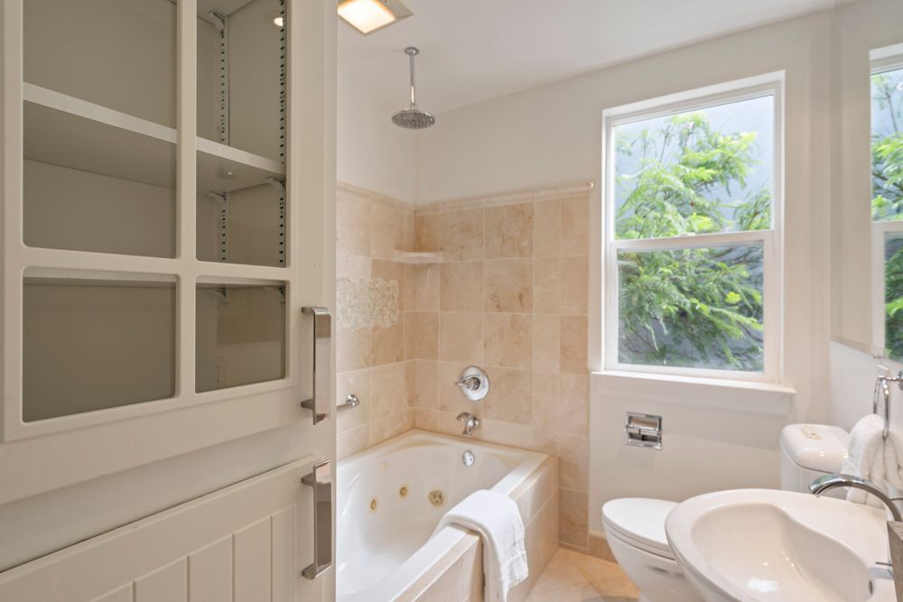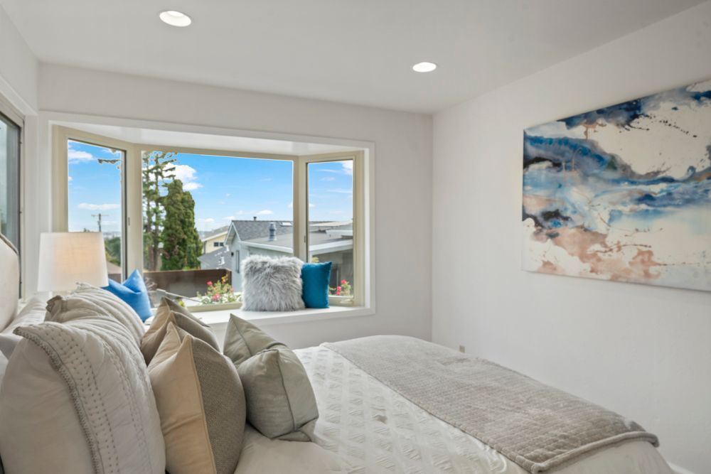 Two additional bedrooms share a full Jack-and-Jill bathroom, ideal for siblings or guests. One bedroom includes a bay window with more peek-a-boo Bay views, and both feature mirrored closets. A third full bath is located off the hallway, featuring porcelain tile with decorative inlays, a jetted soaking tub, and built-in cabinetry, adding both comfort and visual appeal to this part of the home.
