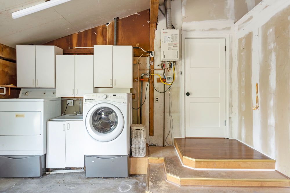 The attached two-car garage has laundry facilities for convenience and provides side yard access. Additional features include recessed lighting throughout, double-pane windows, a tankless water heater, and thoughtful finishing details like baseboard trim and upgraded flooring throughout. Even more storage is accessible with the pulldown attic stairs from the hallway.