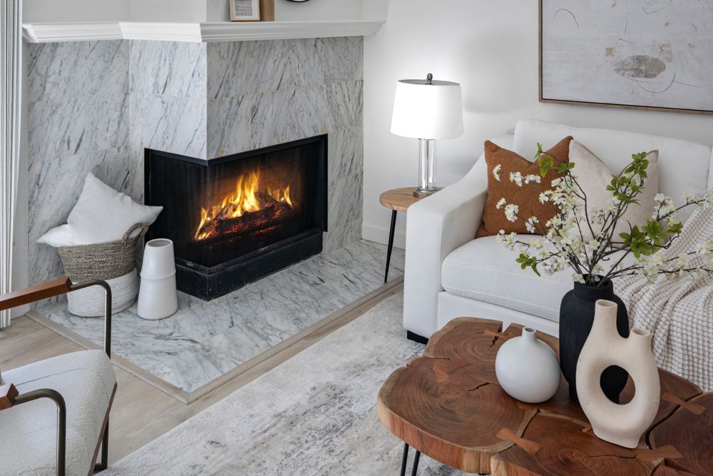 From the entry, the open-concept living and dining areas come into view, with the living room to the right and the dining space to the left. The living room is anchored by a corner wood-burning fireplace with a marble tile surround and crown-molded wood mantle, creating a natural focal point for the space. Across the room, the dining area is defined by a chandelier and leafy views toward the community greenbelt, offering an inviting setting for both casual meals and gatherings. A large window frames the serene landscape beyond, creating a daily visual connection to the surrounding community and greenery.