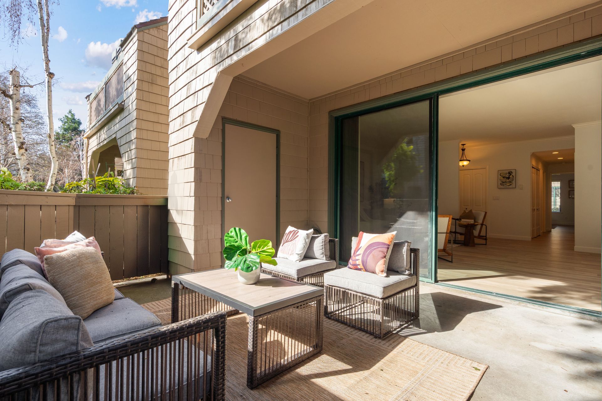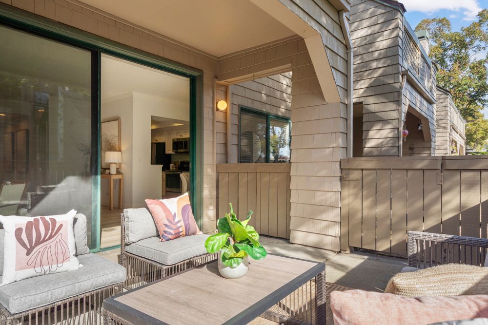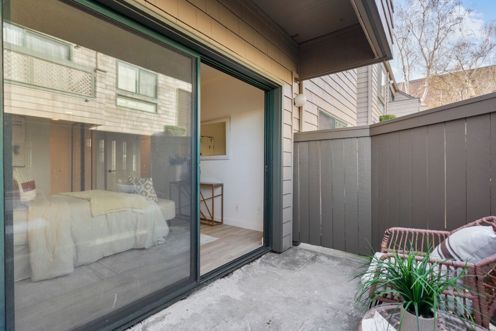 Wide glass sliders extend the living space outdoors to a dedicated patio enclosed by a low wood fence. With a built-in storage closet and tranquil greenbelt views, this generous outdoor area is ideal for barbecuing, entertaining, or enjoying quiet mornings and evenings surrounded by greenery with ample room for potted plants that further personalize the space.