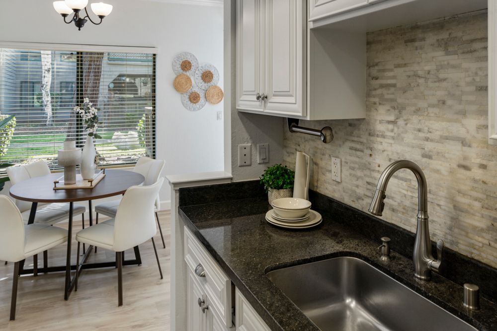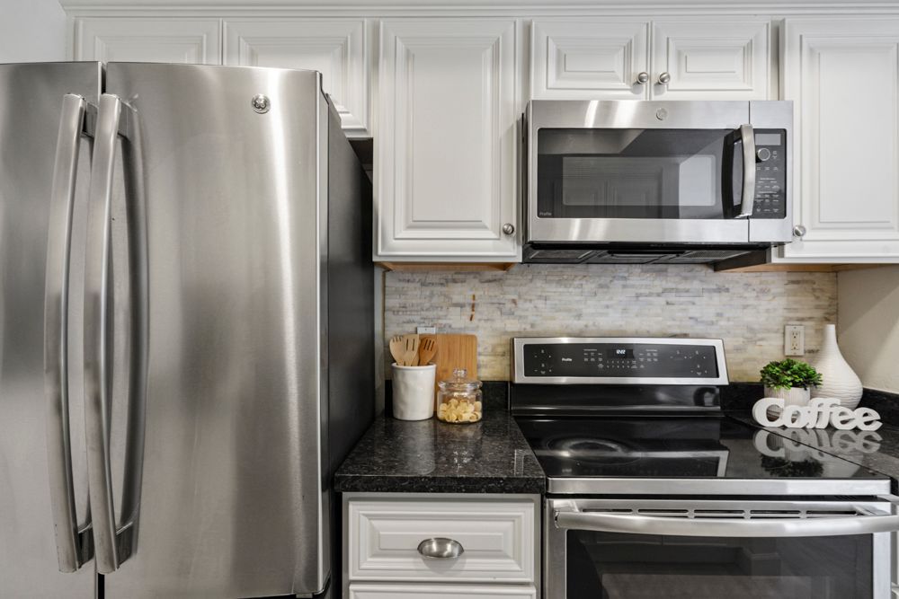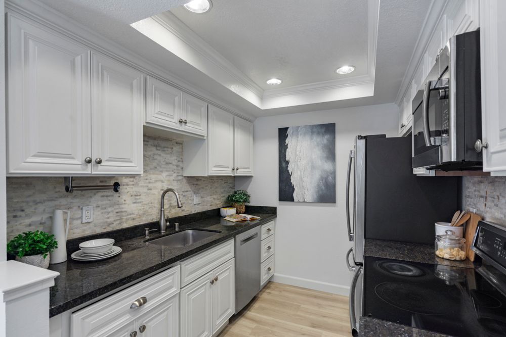 The kitchen blends warmth and function with granite countertops, a stacked-stone backsplash, and stainless steel appliances, including a French-door refrigerator and Bosch dishwasher. White cabinetry with carved wood doors, a tray ceiling, and recessed lighting give the space a refined yet approachable feel, well-suited to both daily routines and hosting.