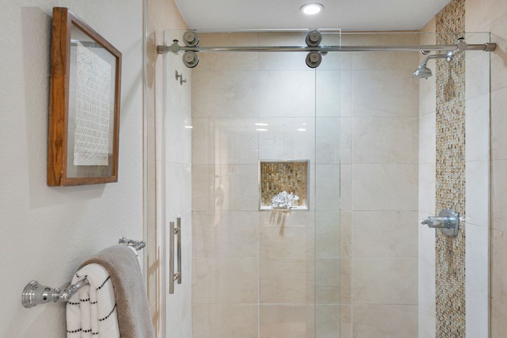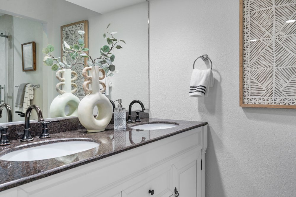 The primary suite is generously proportioned and opens to its own dedicated patio with privacy fencing. A dressing area with two walls of closets leads to the en suite bath, which features porcelain tile flooring, dual sinks with a granite vanity, and a separate wet room with a walk-in shower, sliding glass doors, pebble-stone flooring, and mosaic tile inlay set within a large-format tile surround creating a spa-like environment that elevates everyday routines.