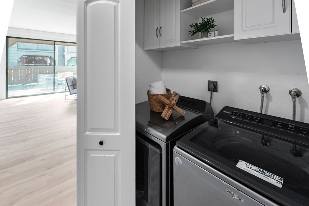 The secondary bedroom offers a closet and a dynamic view of the front courtyard and fountain, providing a pleasant and flexible space for guests, work, or hobbies. A full hallway bathroom includes porcelain tile flooring, a shower-over-tub with glass doors and hex tile surround, a Toto washlet, and a linen storage closet. Nearby, a hallway laundry closet houses full-size side-by-side units with built-in cabinetry overhead for added storage.
